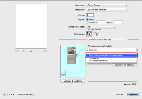 Seleccione [Impresión protegida por contraseña] en [Procesamiento del trabajo].