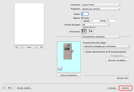Puede introducir la contraseña en el panel de control del equipo e imprimir.