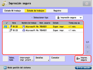 Seleccione el trabajo seguro que desea imprimir → pulse [Impres. segura].