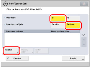 Pulse [Sí] para <Usar filtro> → pulse [Rechazar] para <Directiva prefijada> → pulse [Guardar].