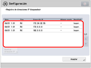 [Configuración] → [Opciones de red] para <Preferencias> → [Registro de direcciones IP bloqueadas].