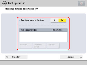 Puede restringir los dominios a los que se envían correos electrónicos. Si solo permite que se envíen mensajes de correo electrónico a direcciones con dominios específicos, evitará las fugas de información. Siga los procedimientos indicados a continuación para especificar el dominio de destino de transmisiones.