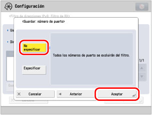 Si utiliza este equipo en un entorno de red, existe la posibilidad de que algún pirata informático entre en él. Especificando las direcciones IP y los números de puertos que pueden acceder al equipo, evitará las transmisiones y los accesos no autorizados.
