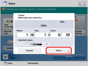 La copia del nuevo trabajo se inicia automáticamente cuando se completa el trabajo actual. Si aparece el mensaje <No se puede imprimir porque las reservas de trabajos están llenas o porque la impresora está calentándose. Espere un momento e inténtelo de nuevo.>, pulse [Aceptar] → intente de nuevo la reserva del trabajo después de haberse completado el trabajo actual.