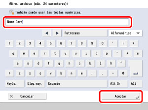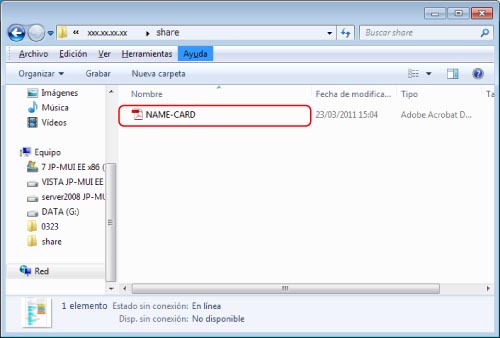 Guarde las tarjetas de presentación leídas en el espacio avanzado del equipo, en el espacio avanzado de otro equipo de en la red o en el dispositivo de memoria.