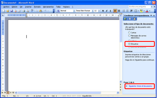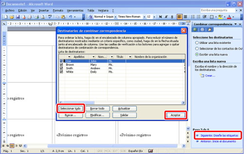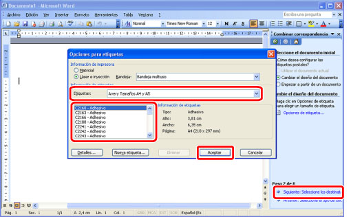 Seleccione el tamaño de las etiquetas para [Etiquetas] → haga clic en [Aceptar] → haga clic en [Siguiente].