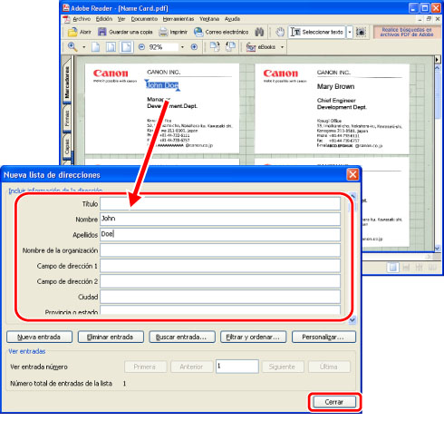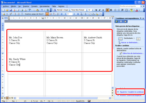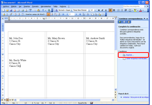 Aplicando la función OCR (texto búsquedas) podrá convertir tarjetas de presentación convertidas a PDF o XPS que tiene texto que es reconocible. El modo PDF o XPS reconocible es útil en muchas situaciones. En esta sección se explica la creación de etiquetas de direcciones empleando la función de [Combinar correspondencia] de Microsoft Word 2003.