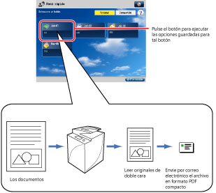 El menú rápido es una función que aumenta la eficiencia de las operaciones que emplean funciones del equipo en una oficina. Podrá crear y guardar una serie de funciones utilizadas con frecuencia, tales como las de copia, leer y enviar, y leer y guardar en un mismo botón.