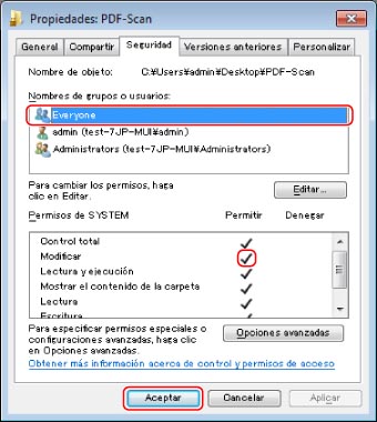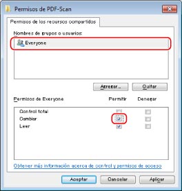 Seleccione [Everyone] → compruebe que está seleccionada la opción [Permitir] en [Cambiar] → haga clic en [Aceptar]. Si no está seleccionada [Permitir], seleccione [Permitir] → haga clic en [Aceptar].