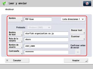 \\Nombre del ordenador\PDF-Lectura Introduzca el nombre del ordenador que marcó en el paso 1 de " Crear una carpeta compartida" ( Para Windows), o el paso 2 de " Crear una carpeta compartida" ( En Mac).