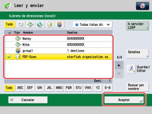 Para leer originales de distinto tamaño, pulse [Originales de dist. tamaño]. Este modo le permite leer juntos, en un mismo grupo, originales de distinto tamaño y de la misma anchura (como A3 y A4, etc.) mediante el alimentador. De esta manera, tardará menos tiempo en enviar los documentos, ya que no será necesario que los envíe según el tamaño del original.