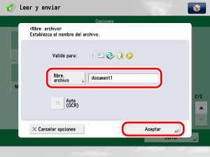 Pulse [Nbre. archivo] → introduzca el nombre del archivo → pulse [Aceptar].