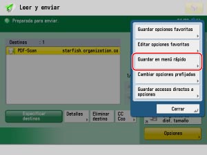 Al guardar en el menú rápido, si [Mostrar confirmación para opciones favoritas] está establecido en 'No', no aparecerá el cuadro de diálogo de confirmación antes de procesar las opciones guardadas en el botón.
