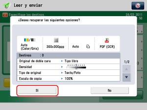 Si selecciona [Sí], las opciones registradas en el botón se procesan al pulsar el botón guardado. No es necesario que usted pulse  para iniciar el trabajo.