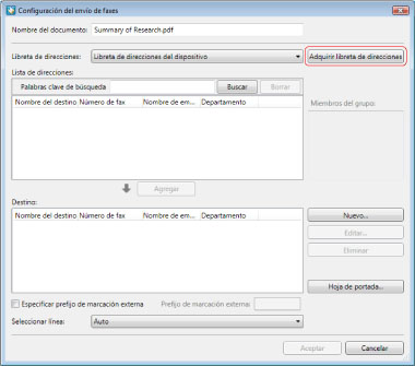 Seleccione [Libreta de direcciones del dispositivo] desde la lista desplegable [Libreta de direcciones] → haga clic en [Adquirir libreta de direcciones].
