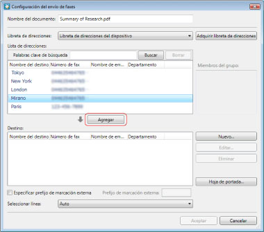 Para añadir una dirección que no esté registrada en la libreta de direcciones de imageRUNNER ADVANCE como destino de la transmisión de fax, abra el cuadro de diálogo [Agregar nuevas direcciones de destino] desde el cuadro de diálogo [Configuración de fax].