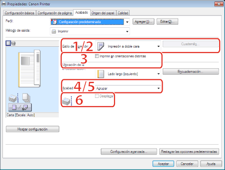 Para conocer las instrucciones acerca de cómo mostrar la pantalla del controlador de impresora, consulte "Impresión" o "Configurar las opciones de impresión prefijadas".