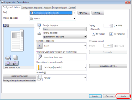 Puede mostrar la ayuda en línea haciendo clic en [Ayuda] en la pantalla del controlador de impresora.
