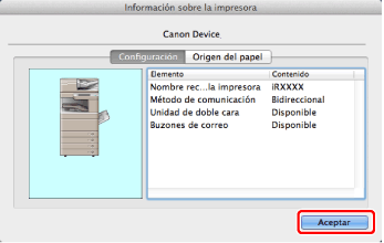 Si el nombre del controlador de impresora que se muestra en la parte superior del cuadro de diálogo [Información sobre la impresora] no se corresponde con el nombre de la impresora que se muestra como [Nombre recuperado de la impresora], es posible que no pueda utilizar las funciones de la impresora correctamente. Si los nombres no se corresponden, elimine la impresora que ha añadido en [Preferencias del Sistema] y vuelva a añadirla. Para obtener información detallada, consulte la Guía del controlador de impresora (consulte " Instalación").
