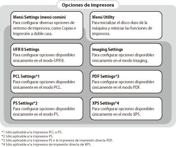 Puede especificar diversas opciones que afectan a la función de impresora del equipo. Entre ellas, se incluyen algunas opciones que no se pueden especificar de forma remota desde una aplicación o desde el controlador de impresora. Estas opciones se conocen como Funciones de menú.