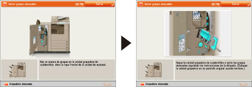 Si se produce un atasco de grapas, aparece una pantalla indicativa de la posición del atasco de grapas y las instrucciones de eliminación del atasco en la pantalla táctil. Siga las instrucciones de la pantalla para eliminar el atasco de grapas. La pantalla aparece repetidas veces hasta haber eliminado el atasco de grapas. Si pulsa [Cerrar], puede seguir realizando ciertas operaciones, como configurar modos o leer originales, aunque no extraiga inmediatamente las grapas atascadas.