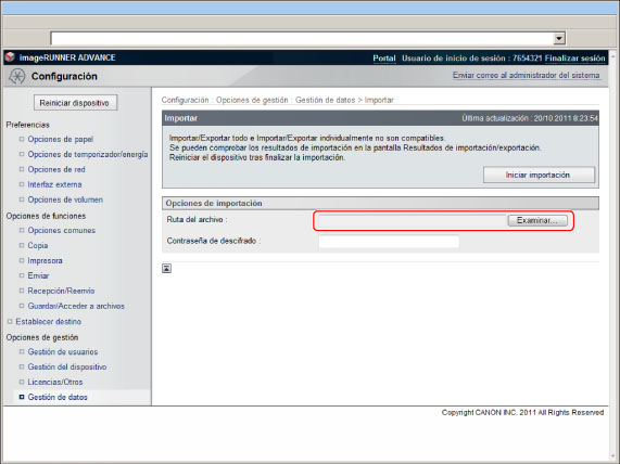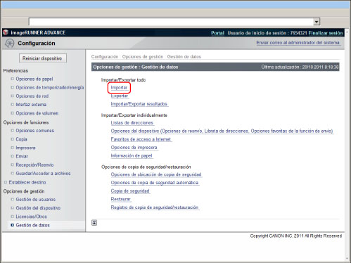 Si importa las opciones de gestión de ID de departamentos utilizando la función Importar todo, las opciones información administrador sistema como un ID o contraseña se sobrescribirán. Compruebe la información del administrador del sistema del equipo para exportación antes de utilizar la función Exportar todo, ya que se requiere para iniciar sesión en el equipo de destino para importación.