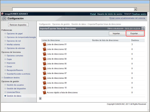 Haga clic en [Opciones del dispositivo (Opciones de reenvío, Libreta de direcciones, Opciones favoritas de la función de envío)] para <Importar/Exportar individualmente> → [Exportar...].