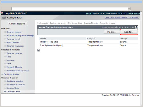 Haga clic en [Información de papel] para <Importar/Exportar individualmente> → [Exportar...].