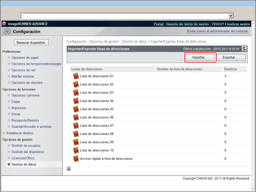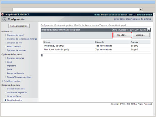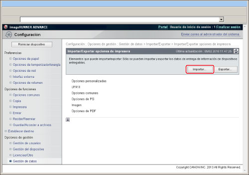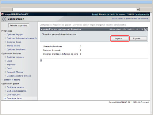 Tras haber importado las opciones de dispositivo, la IU remota no se podrá utilizar para realizar otras operaciones hasta después de haber reiniciado el equipo. Apague la alimentación principal del equipo y enciéndala de nuevo.