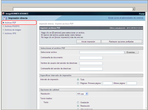 Para imprimir un archivo PDF sin abrirlo se requiere el Kit de Impresión Directa (para PDF/XPS) o Kit de Impresora PS.