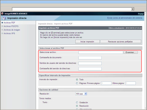 Para imprimir un archivo PDF especificando su URL, sólo se admite el protocolo HTTP.