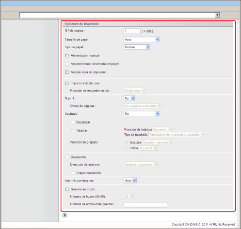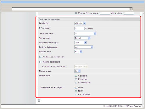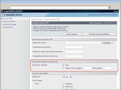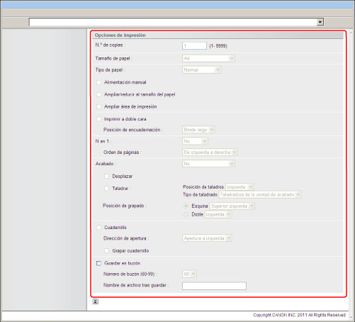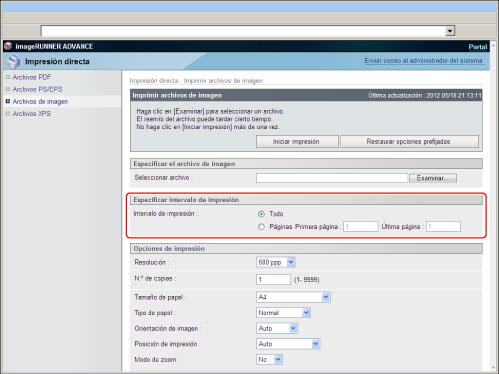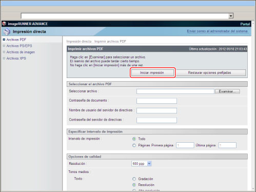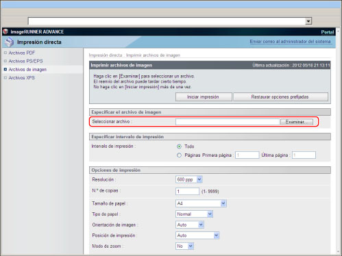 Para imprimir especificando una URL, es necesario establecer [Usar impresión refer.] en 'On' en [IU remota] de [Opciones de gestión] (Configuración).
