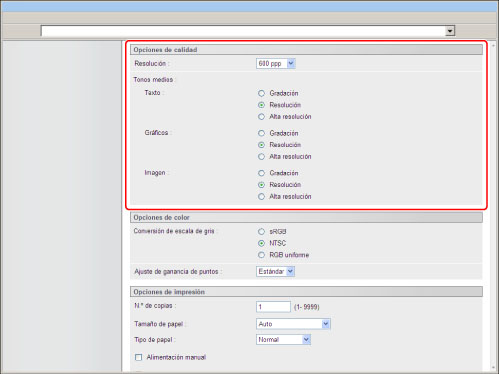 Ha seleccionado [Resolución], y puede imprimir el texto con contornos bien definidos, lo cual está indicado para imprimir texto y líneas finas.