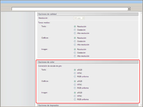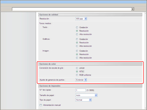 Puede seleccionar las formas de convertir valores de color a valor de escala de gris cuando imprima datos de color.