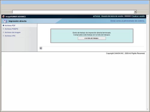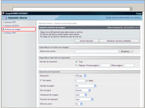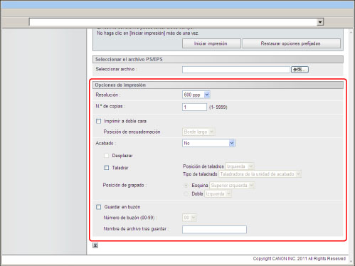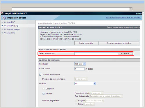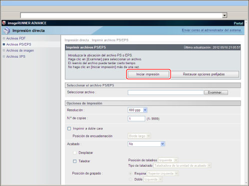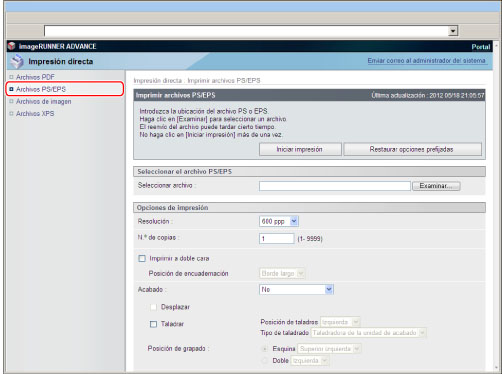 Para imprimir archivos PS/EPS directamente desde la IU remota, es necesario activar el Kit de Impresora PS.
