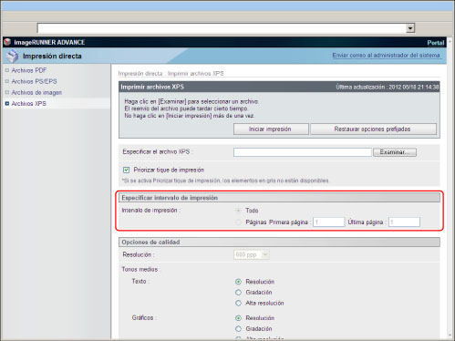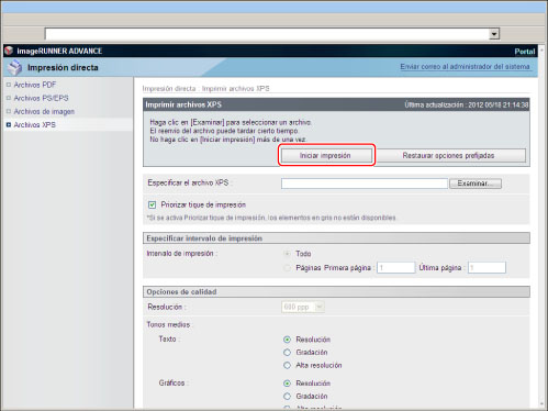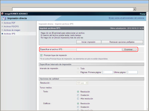 Para imprimir un archivo XPS sin abrirlo se requiere el Kit de Impresión Directa (para PDF/XPS).