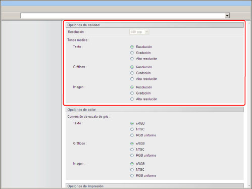 Las opciones de visualización de la pantalla táctil para utilizar con Impresión directa son 'Opciones comunes', 'Opciones de Imaging', 'Opciones de PDF' y 'Opciones de XPS'. Para más información acerca de estas opciones, consulte "Opciones de funciones: Impresora".