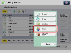 Si desea crear una dirección de grupo, es necesario guardar de antemano los destinos (como las direcciones de correo electrónico y las direcciones de los servidores de archivos).
