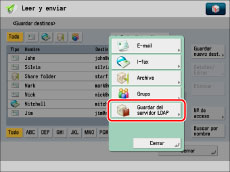 Puede guardar una dirección de e-mail obtenida buscando la listas de directorios de la red con servidores LDAP (Lightweight Directory Access Protocol).