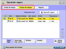 Muestra información detallada del trabajo seleccionado. Compruebe la información detallada → pulse [Aceptar] para volver a la pantalla Estado de trabajos o Estado Mi trabajo.