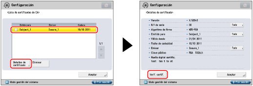 Seleccione el par de claves para el certificado de CA que desee confirmar → pulse [Detalles de certificado] → [Verif. certif.].