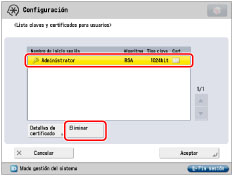 Para información acerca de cómo un usuario general puede mostrar el certificado de usuario, consulte "Comprobar un certificado de firma de dispositivo/firma de usuario". No obstante, en este caso sólo se muestra el certificado de usuario para el usuario que ha iniciado sesión. No es posible mostrar los certificados de usuario de los otros usuarios. Tampoco se puede eliminar el certificado de usuario en esta pantalla. El usuario general debe usar la IU remota para eliminar su certificado de usuario. (Consulte "Instalar un archivo de certificado".)