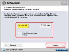 Puede incrustar un código QR que restrinja la copia de documentos. No es posible copiar documentos si se detecta [Prohibir todo].