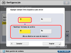 Pulse [Agregar siempre firma dispositivo para envío] → [Sí] para <Agregar siempre firma dispositivo para envío> → especifique la opción para <Restringir formatos de archivo>.