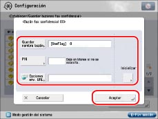 Pulse [Guardar nombre buzón] → introduzca un nombre → pulse [Aceptar].