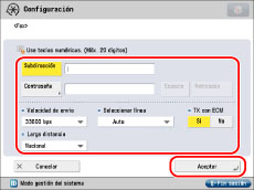 Si introduce una pausa al final del número, su duración es siempre de 10 segundos. Pulse [Establecer detalles] para especificar las opciones de subdirección, contraseña, TX con ECM, velocidad de envío, y larga distancia. Si configura el equipo para utilizar varias líneas, puede seleccionar la línea que se utilizará para enviar.