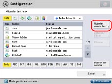 Si está instalada la tarjeta de fax o se ha activado el Kit de Fax Remoto: nombres, direcciones de e-mail y números de fax