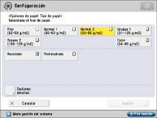 Si se muestra [Person.] como tamaño de papel cuando cargue papel estándar, pulse [Tamaño personalizado] → [Cancelar opciones]. El tamaño del papel se detectará automáticamente y se mostrará en la pantalla.