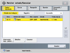 Si establece [Copia/Impresión], [Estado de trabajos], [Impresión] como Pantalla prefijada (Monitor estado/Cancelar):