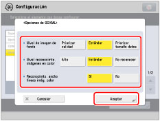 El nivel de reconocimiento y el tamaño de datos están entre los de [Alta] y [No reconocer].